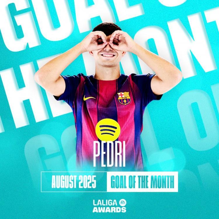 直播吧9月10日讯 西甲官方消息,佩德里对阵莱万特打入的远射当选联赛8月最佳进球。