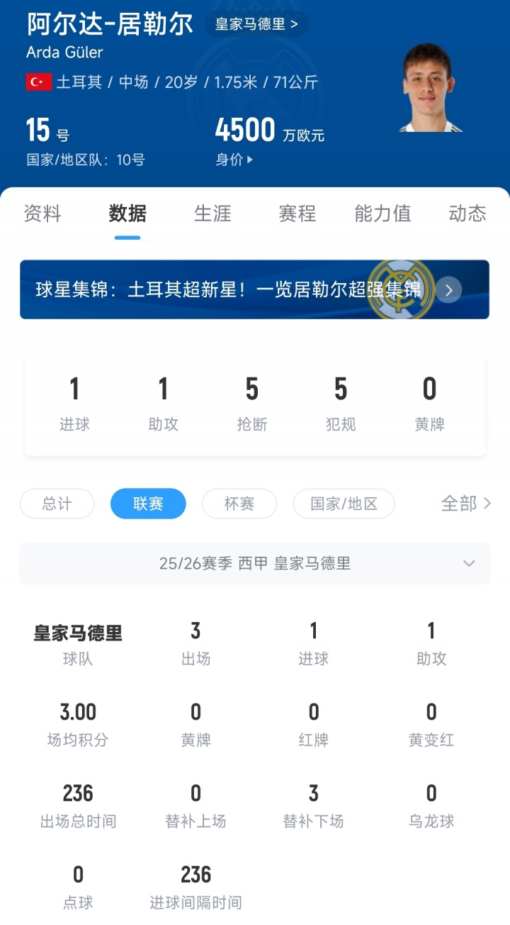 20岁的土耳其中场居勒尔,2023年夏窗以2400万欧元的转会费从费内巴切加盟皇马,签约至2029年。目前居勒尔的德转身价为4500万欧元。